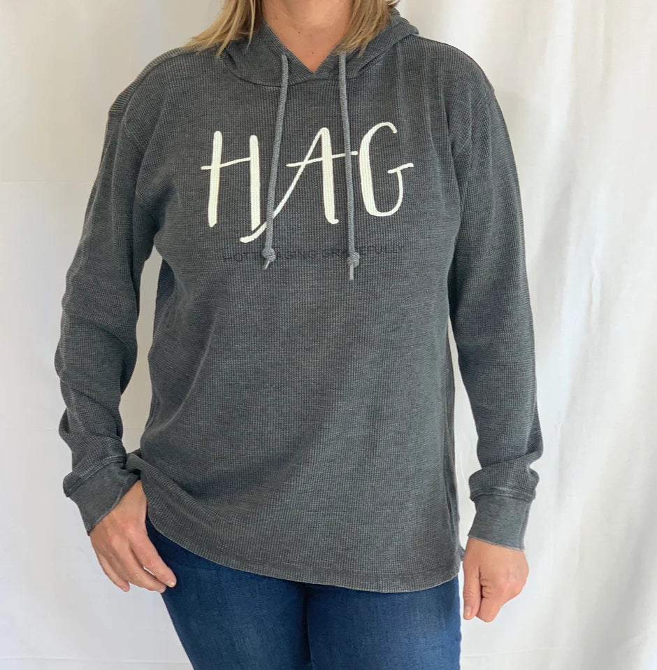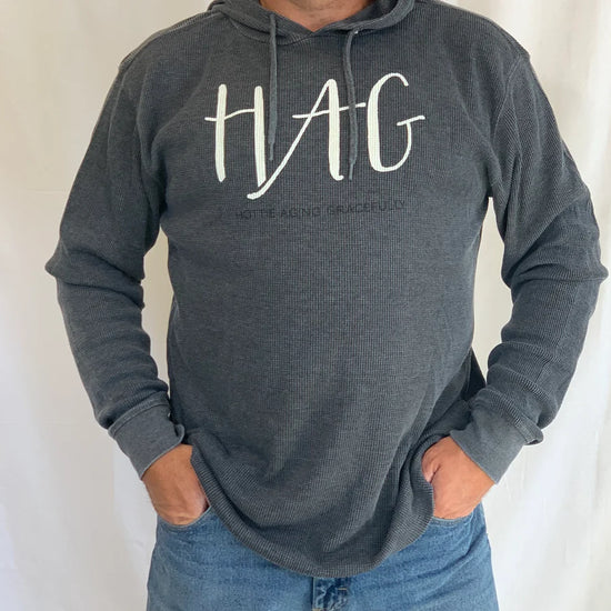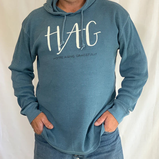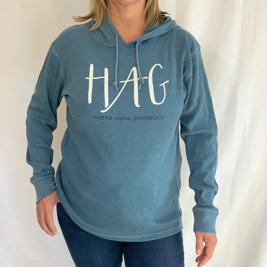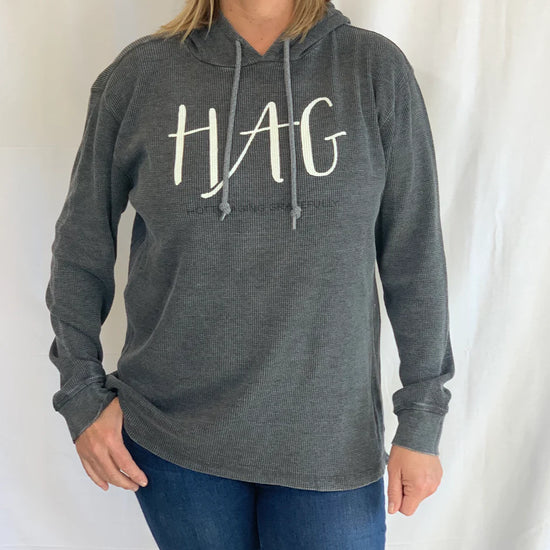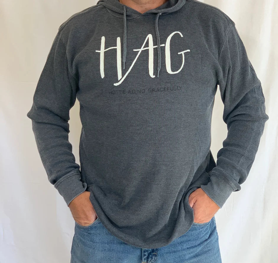 Burnout Wash Thermal Hoodie is our lighter weight hoodie with a look that is 100% on-trend. A great option for cooler mornings that move toward warmer days. HAG in cream lettering and Hottie Aging Gracefully in black lettering.