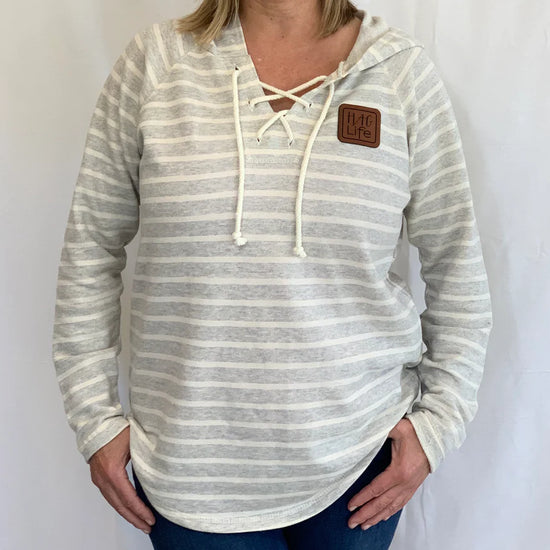 Our cozy-warm French terry hoodie with a popular lace-up neck and trendy stripe pattern has fashion and function. It's an all in one hoodie! Offered in Bone/Heather Grey with logo leather patch detail.