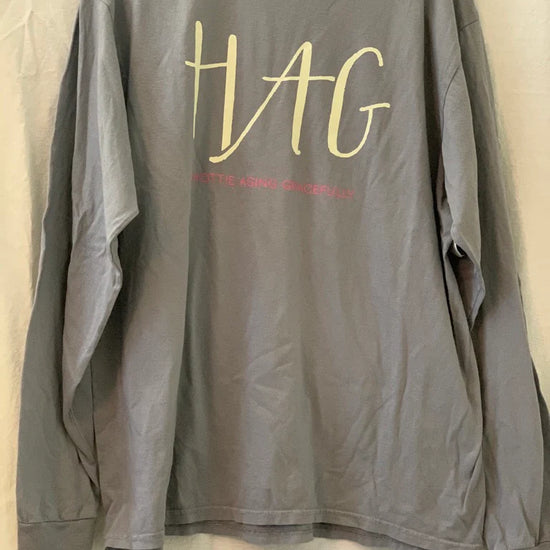 A staple silhouette in a super comfortable ringspun cotton; you will feel the difference. Great for locations where temperatures fluctuate. Available in dark or light grey with HAG in cream and Hottie Aging Gracefully in hot pink.