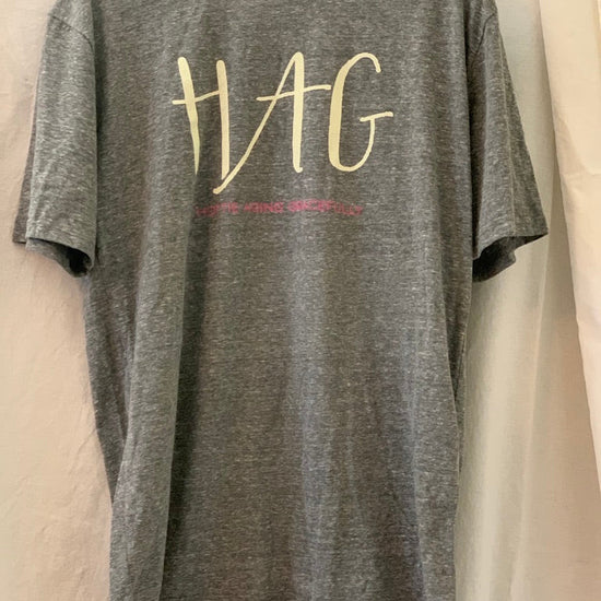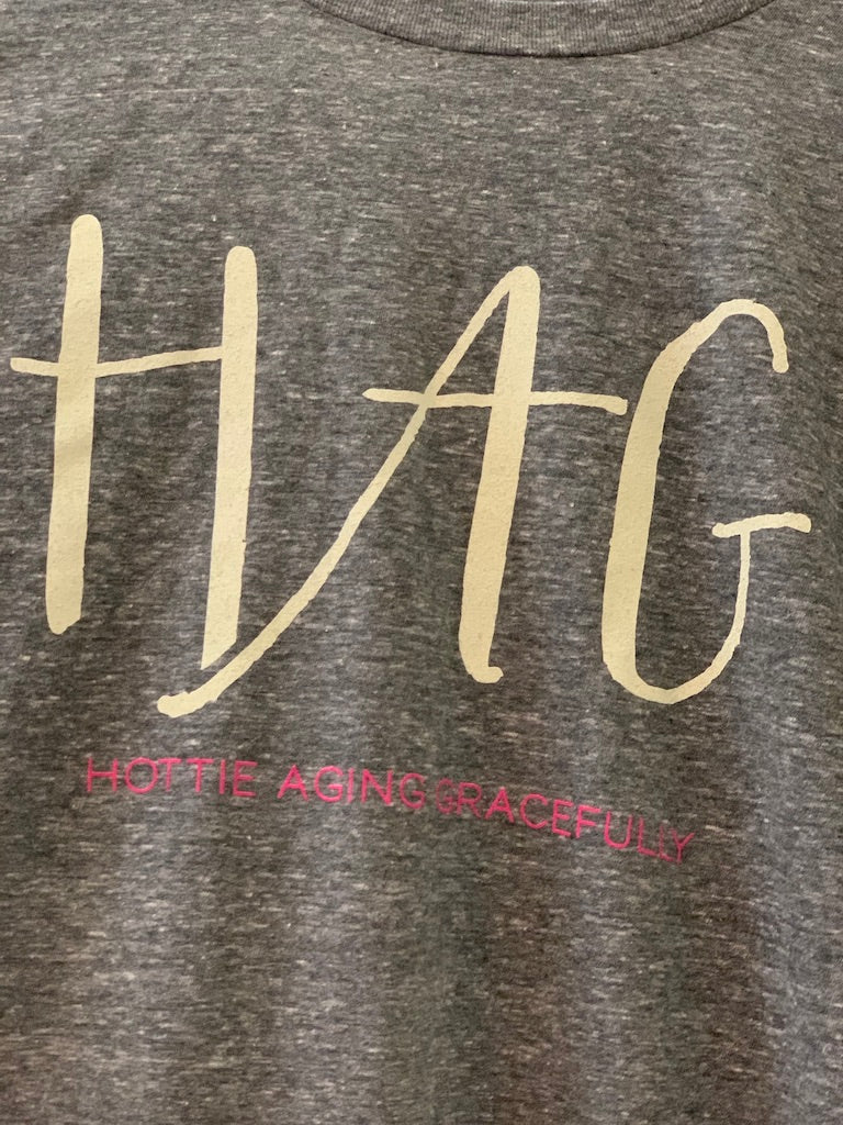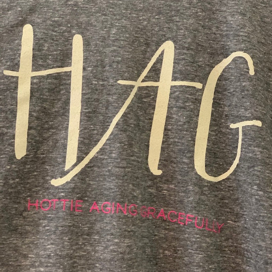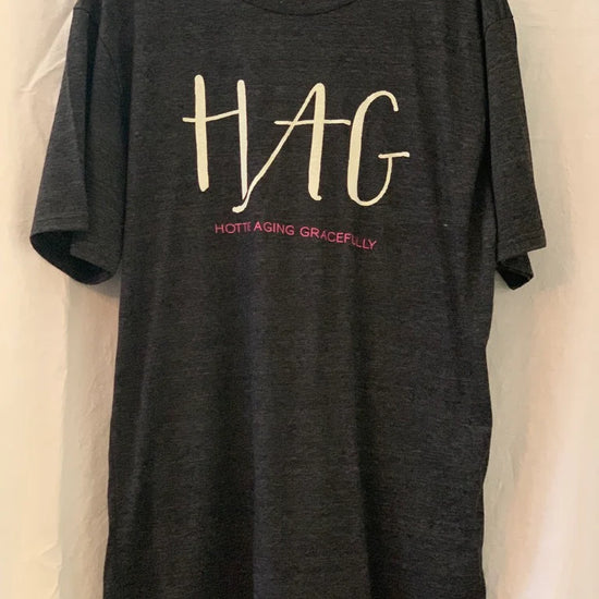 Little touches like double-needle stitching on the hem and sleeves make this NOT your average classic tee. Add in the perfect mix of poly, cotton, and rayon and this is a home run. Black or grey tee with HAG in cream, Hottie Aging Gracefully in hot pink on front.