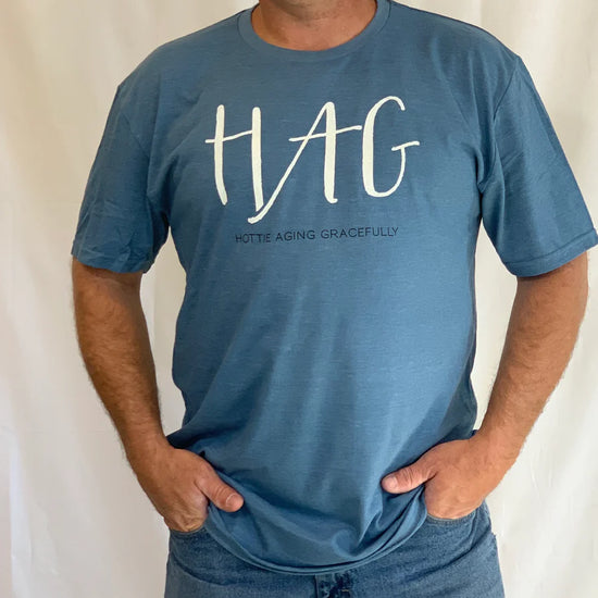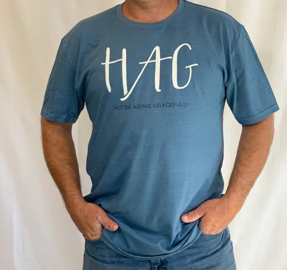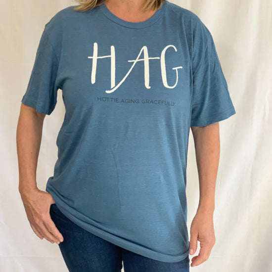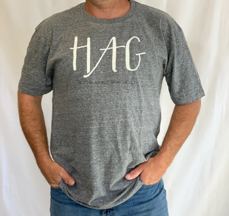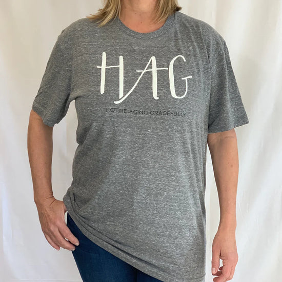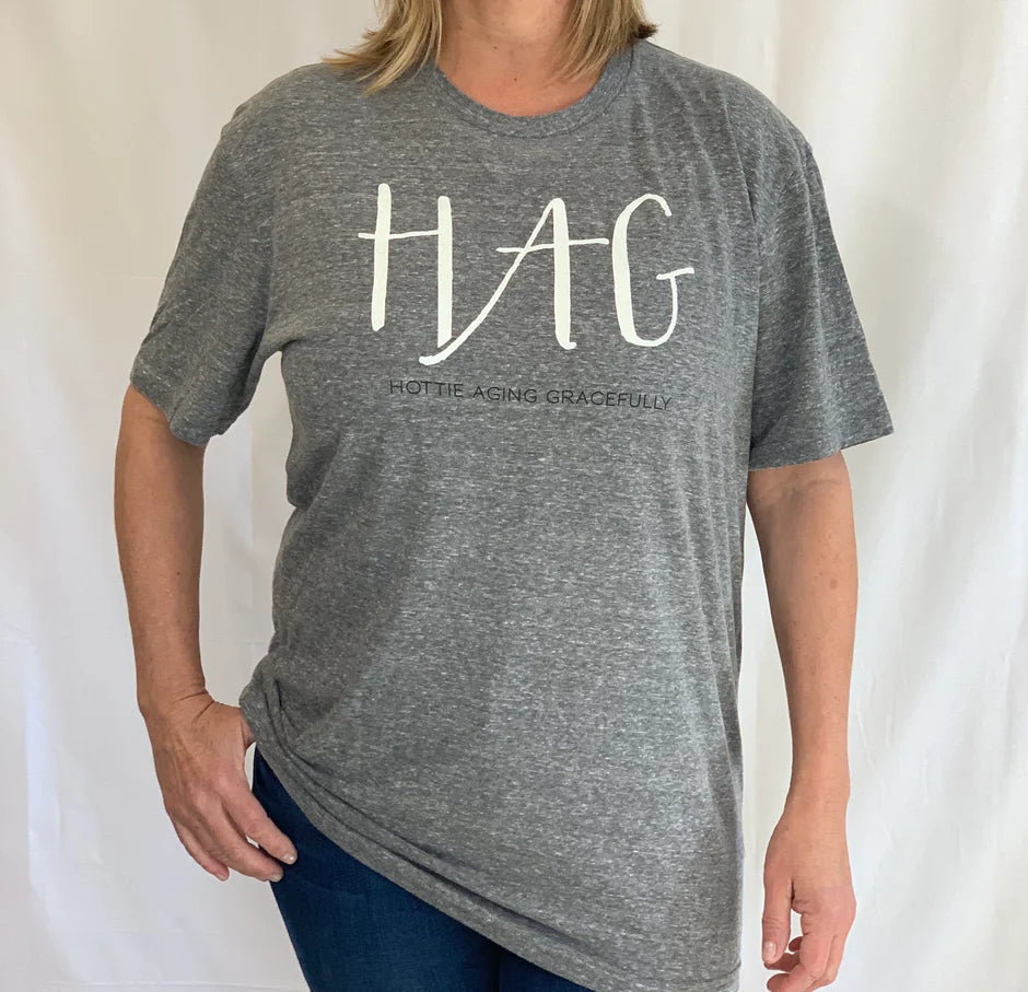 This Unisex Tri-Blend T-shirt is the perfect combination of softness and a lightweight feel! Wear it alone on a hot summer day, during your fav workout or layered under one of our many HAGLife hoodies. HAG in cream lettering and Hottie Aging Gracefully in black lettering on front.